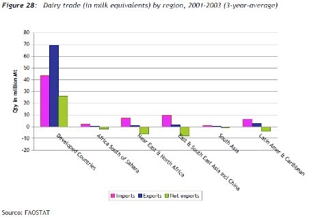 As far as dairy trade is concerned; Globally dairy sector is probably one of the most distorted agriculture sectors. Producer subsidies are in place in many developed countries, encouraging surplus production, export subsidies are paid by Governments tom push this excess production in the World markets, and tariff & non-tariff barriers are erected by both, developed & developing countries to protect their dairy industry from ‘unfair’ competition. These market distortions are having significant and different impact on producers & consumers in developing & developed countries, which are very difficult to quantify. It has been claimed that, dairy regimes of developed countries, especially Europe & US are devastating farmers of developing World where the livelihoods of thousands of poor small farmers have been destroyed by imports of cheap subsidized dairy products.